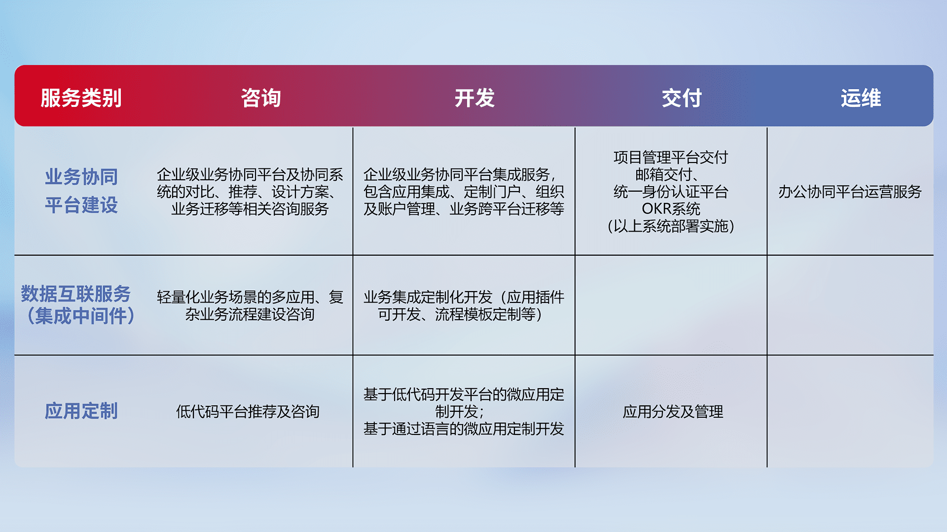 针对钉钉、、、企微、、、IDaas等平台级产品提供产品的规划、、、方案、、、、交付、、定制化开发等服务,,,实现如统一协同办公、、、、智能客户服务、、、、混合会议管理、、、智能数据查询、、、等业务场景,,实现数字化转型。。