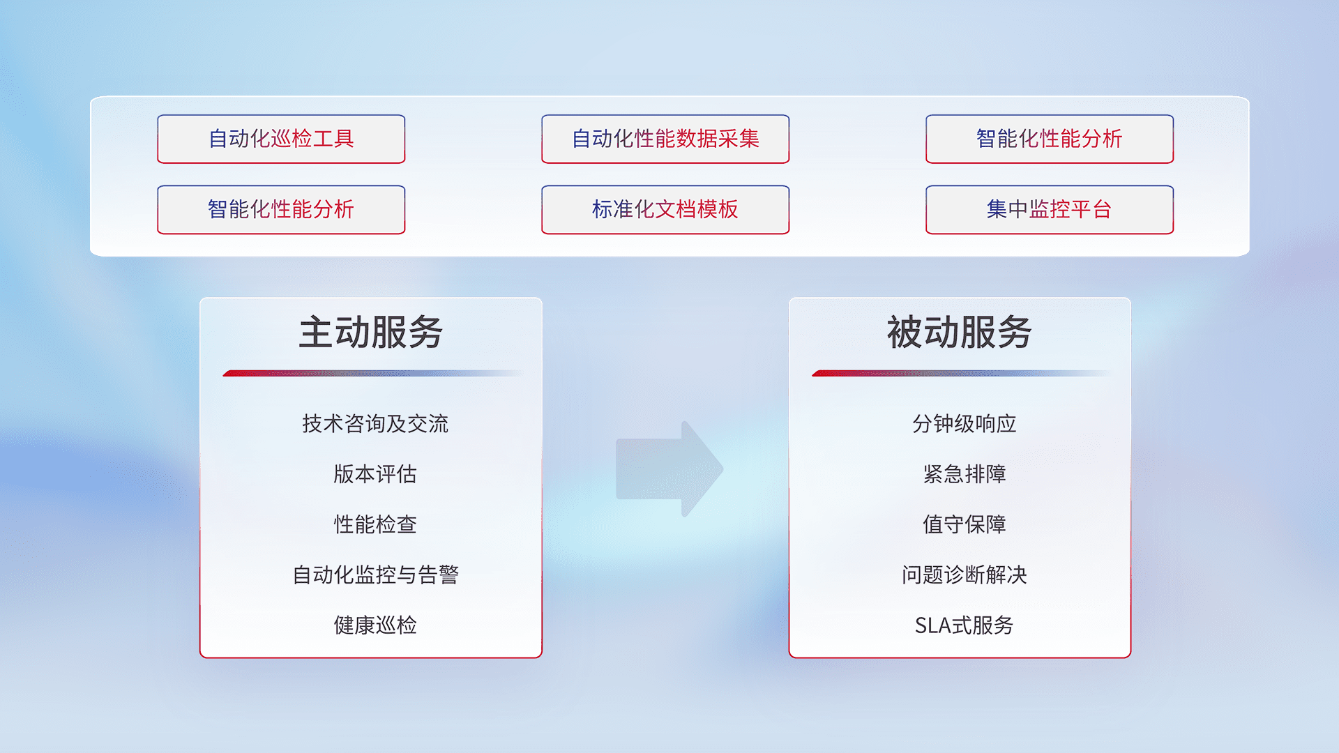 智能化工具和标准化文档,,保障服务质量,,,,提供主动服务(包含技术咨询、、、版本评估、、、、性能检查、、自动化监控与告警、、、健康巡检)和被动服务包含(分钟级响应、、、紧急排障、、、值守保障、、、、问题诊断解决、、、SLA服务)。。。