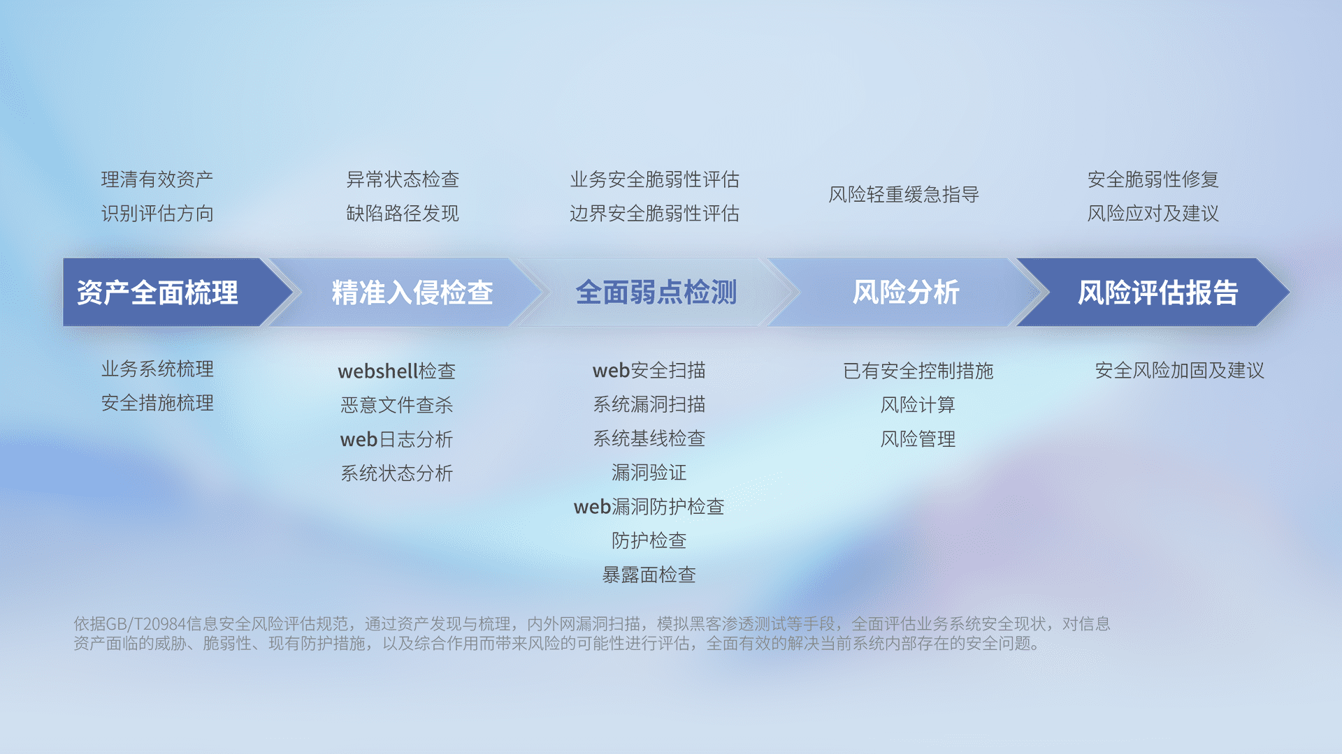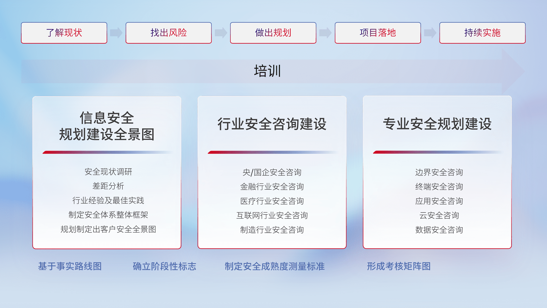 针对客户行业特性,,以专业的安全服务+多厂商联合解决方案提供专属的一站式安全管理服务,,,帮助客户全面感知网络空间威胁,,,基于识别、、检测、、、分析、、防护、、监测、、响应的服务理论模型,,从方案咨询、、、集成交付、、、评估验证、、、优化加固、、运维运营,,致力于为客户提供完整的闭环管理式安全服务。。。以实战经验为客户打造高抵御风险的安全体系,,帮助客户发现威胁、、、对抗威胁、、、、处置威胁,,不断积累安全对抗能力,,,持续保障数字化安全。。。。